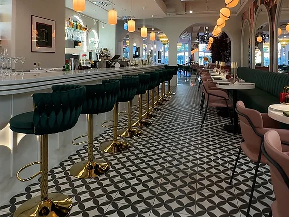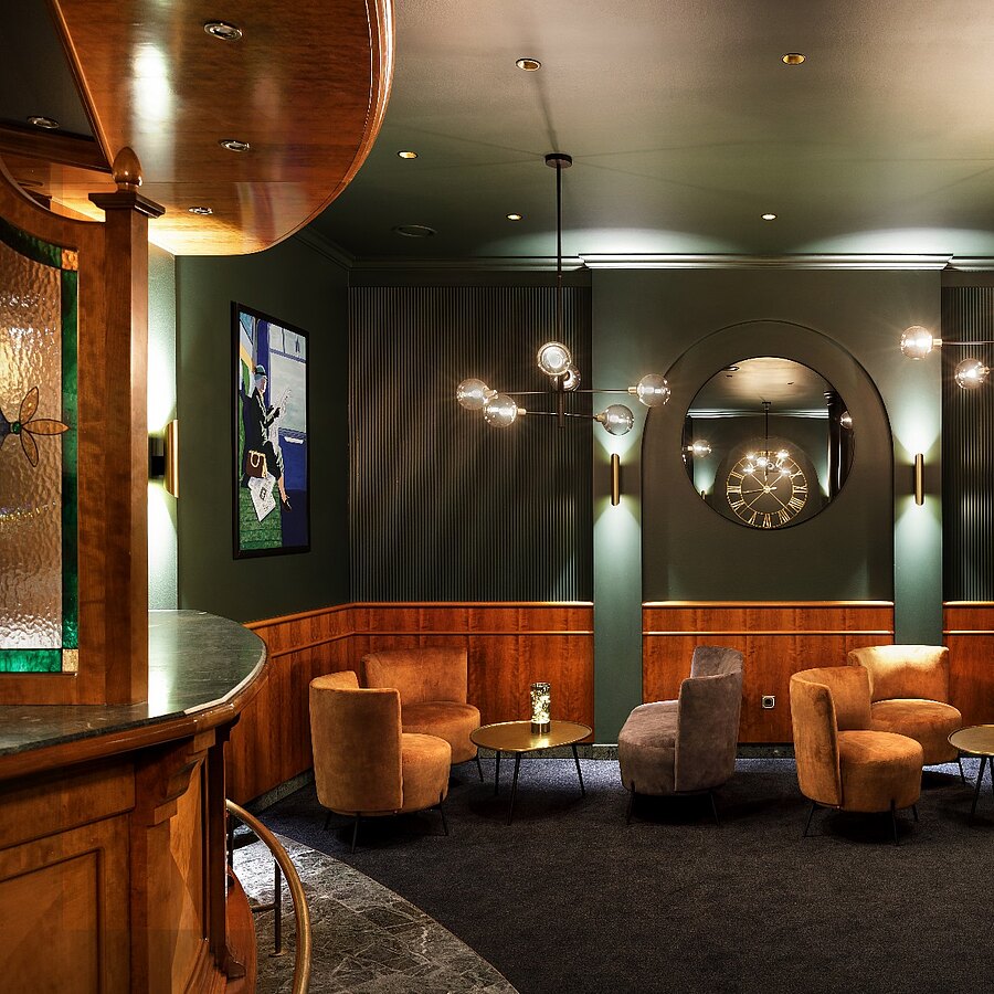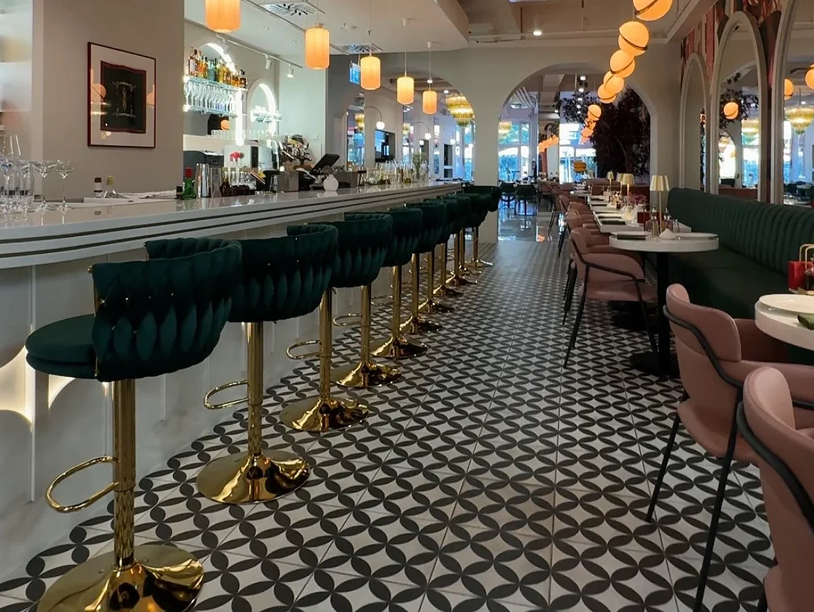 Bogenleuchten an den Wänden schaffen warme Lichtakzente, während Möbel in Bordeaux, Altrosa und dunklem Grün eine edle Atmosphäre prägen. Der mit französischen Mosaikfliesen in Schwarz-Weiß gestaltete Boden bildet ein markantes Gestaltungselement.
