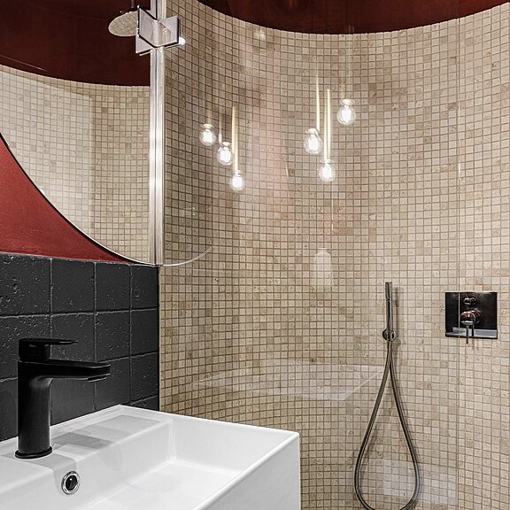 Das Highlight ist die offene Walk-in-Regendusche mit feinen Mosaikfliesen, die das Licht sanft reflektieren und dem Raum eine luxuriöse Tiefe verleihen. In Kombination mit Oberflächen in Thermo- und Natursteinoptik, hochwertigen Armaturen und einem stimmungsvollen Lichtkonzept entstand ein privater Wellnessbereich mit Spa-Charakter im eigenen Zuhause.